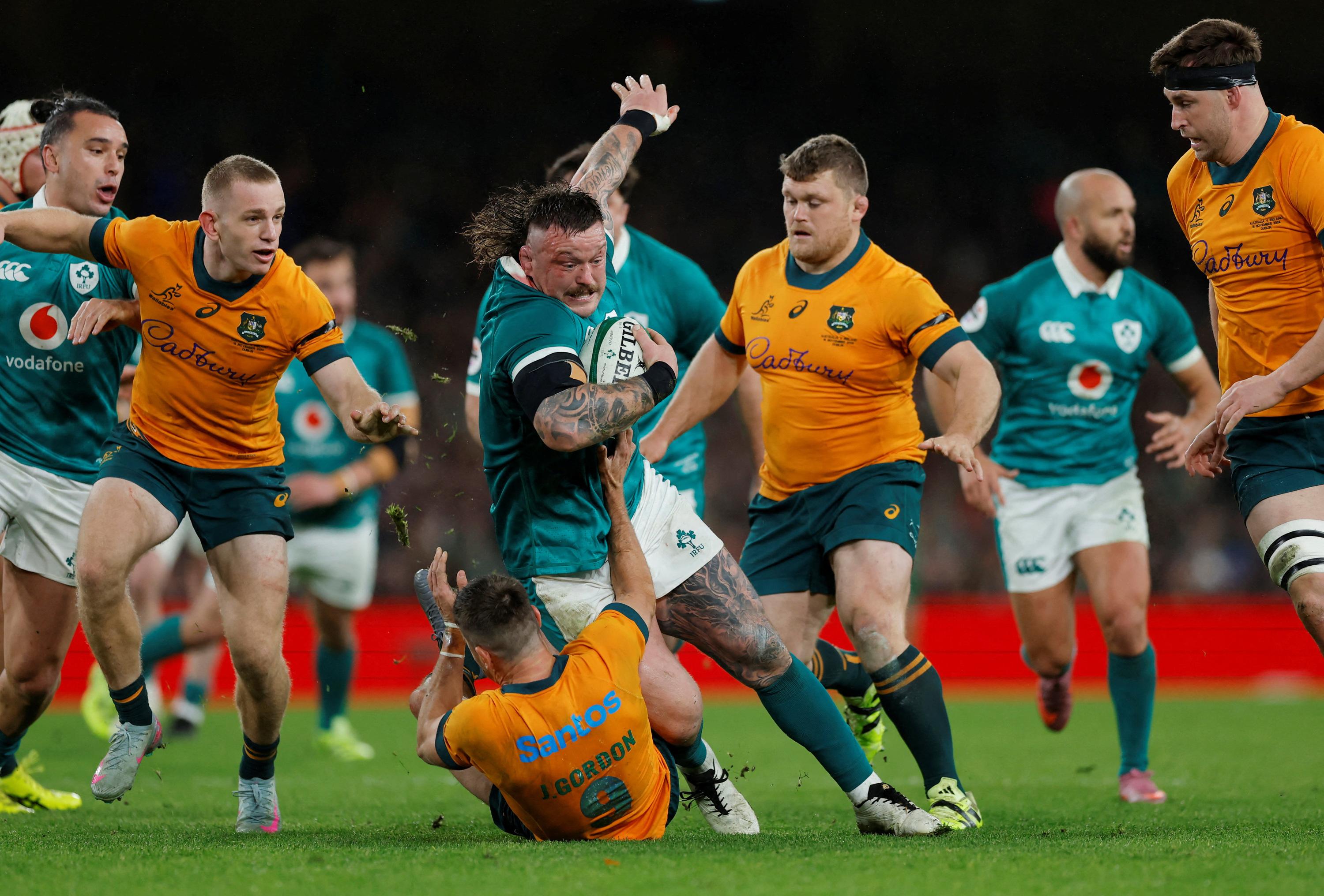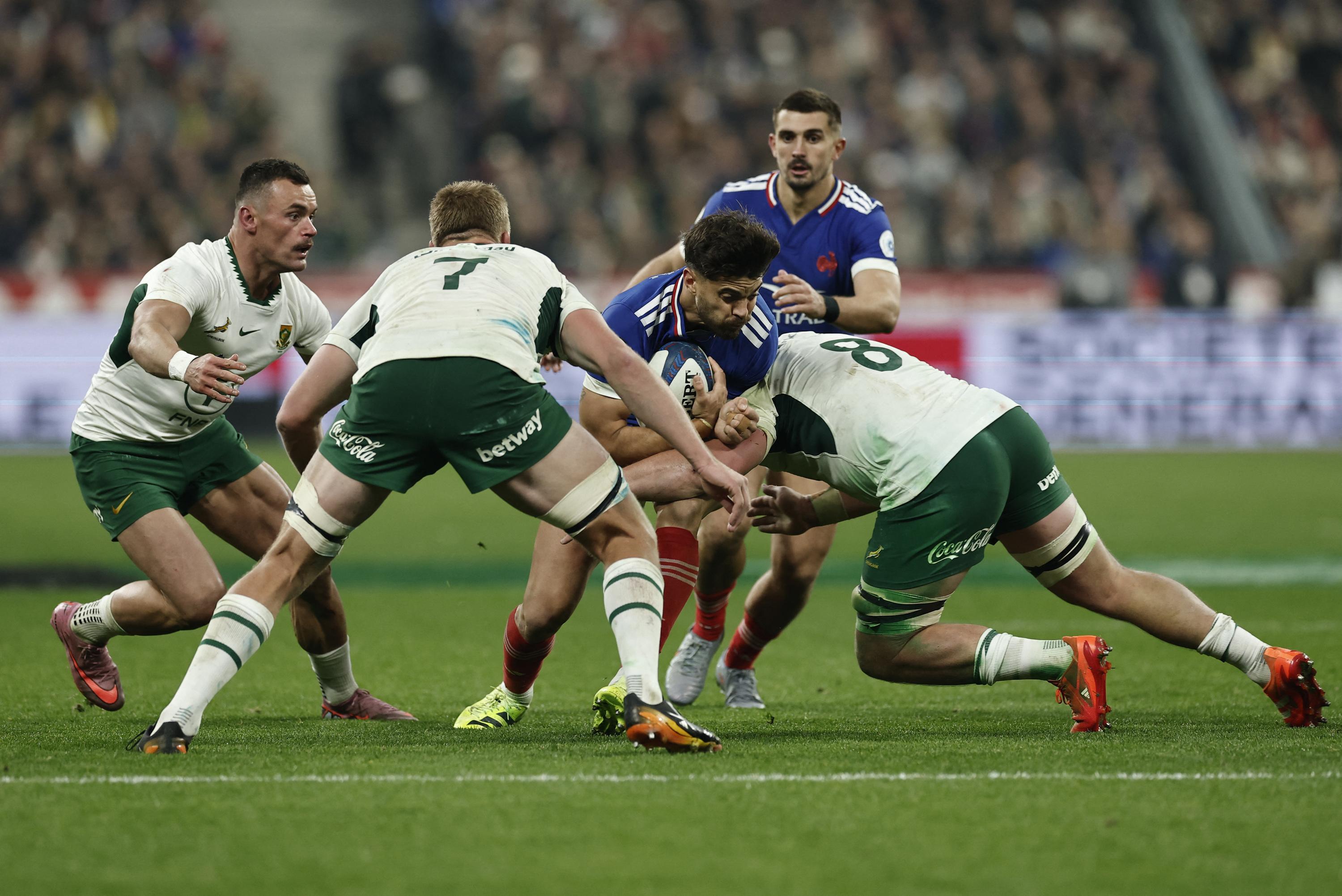 Romain Ntamack, plaqué par le troisième-ligne centre sud-africain, Jasper Wiese, lors de la défaite des Bleus contre les Springboks, le 8 novembre, au Stade de France.