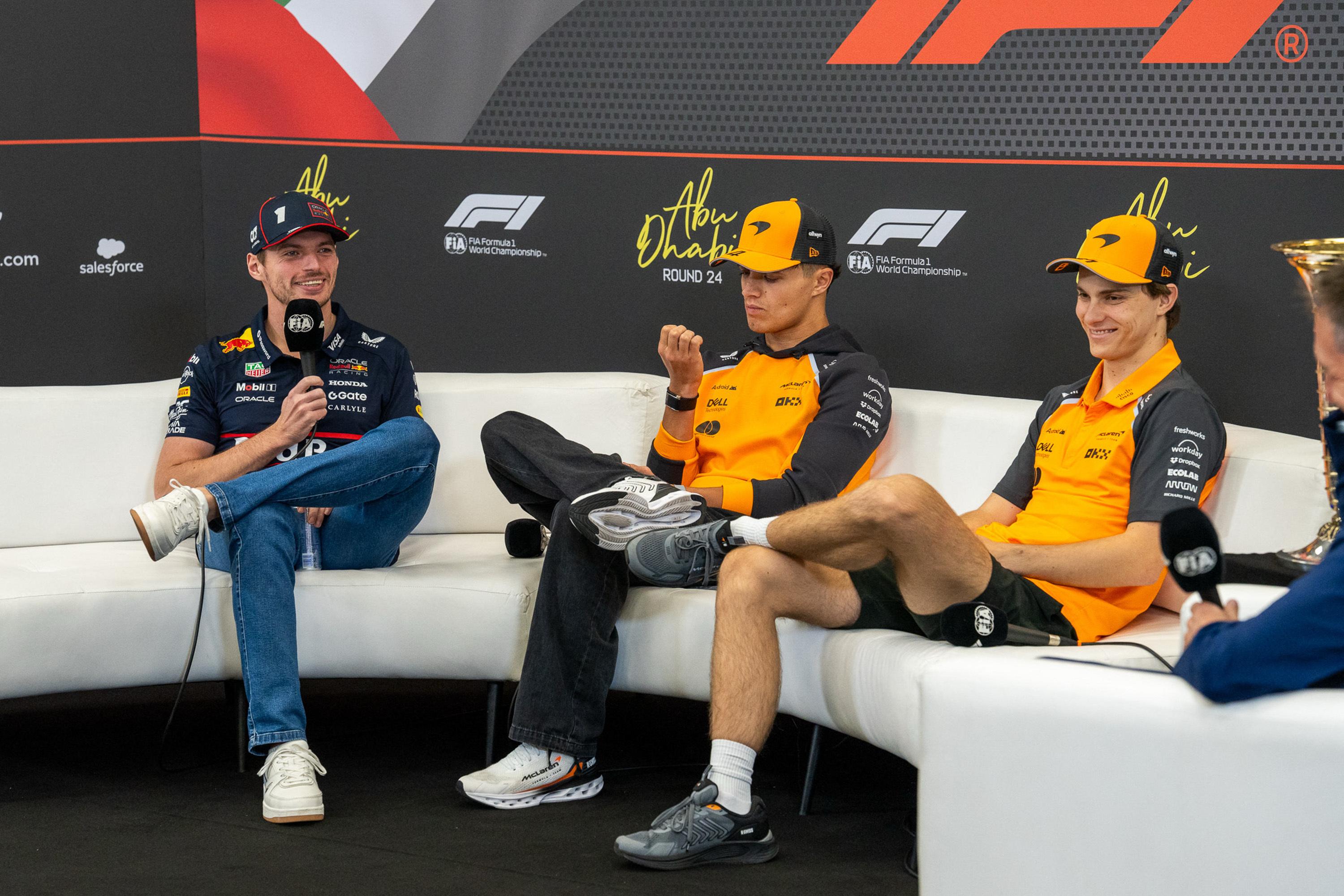 Max Verstappen, Lando Norris et Oscar Piastri, jeudi lors dal conférence de presse officielle du Grand Prix d’Abu Dhabi.