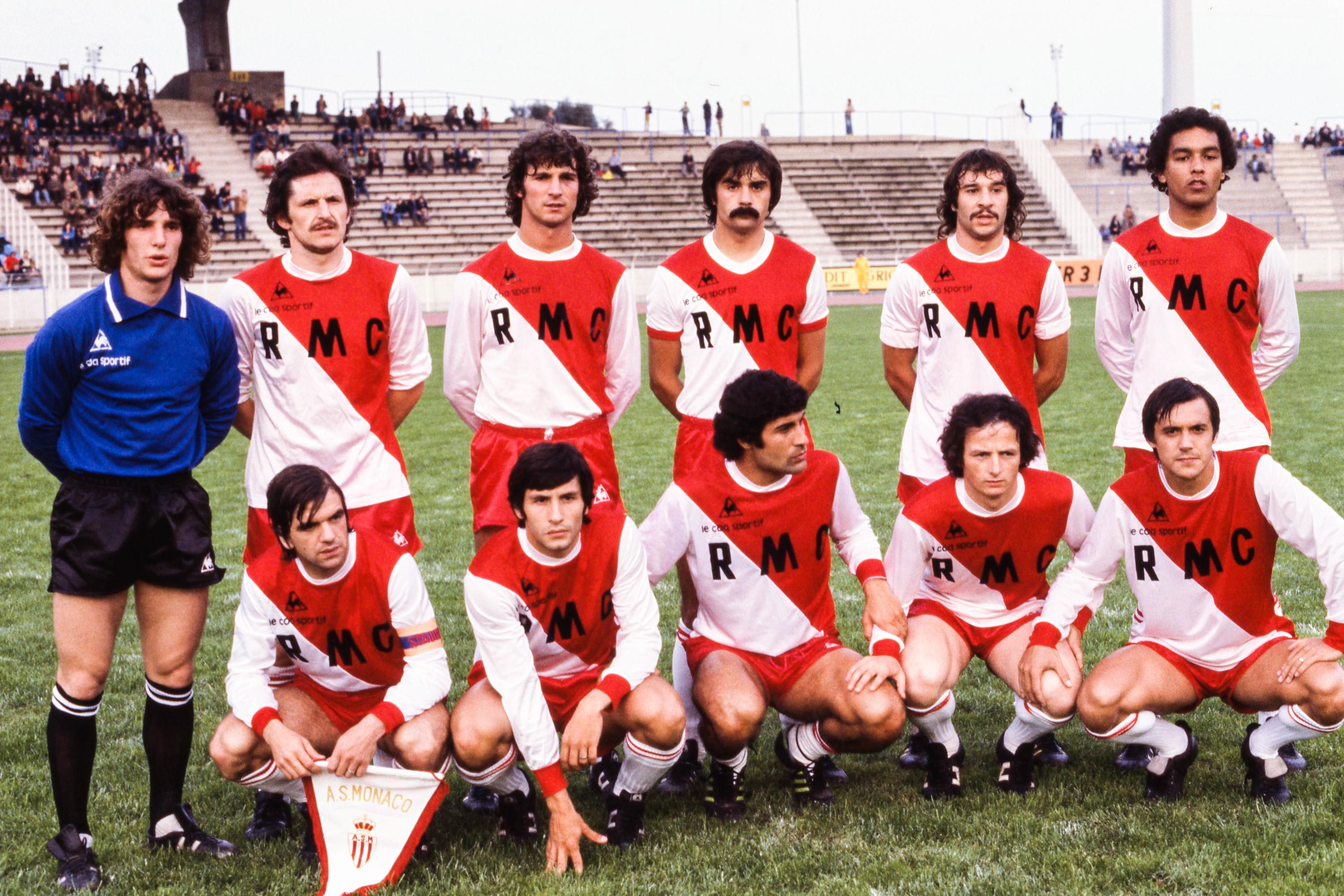 Jean-Luc Ettori maillot bleu et Rolland Courbis, troisième joueur debout en partant de la gauche avec l’AS Monaco en 1978 face au Stantard de Liège.
