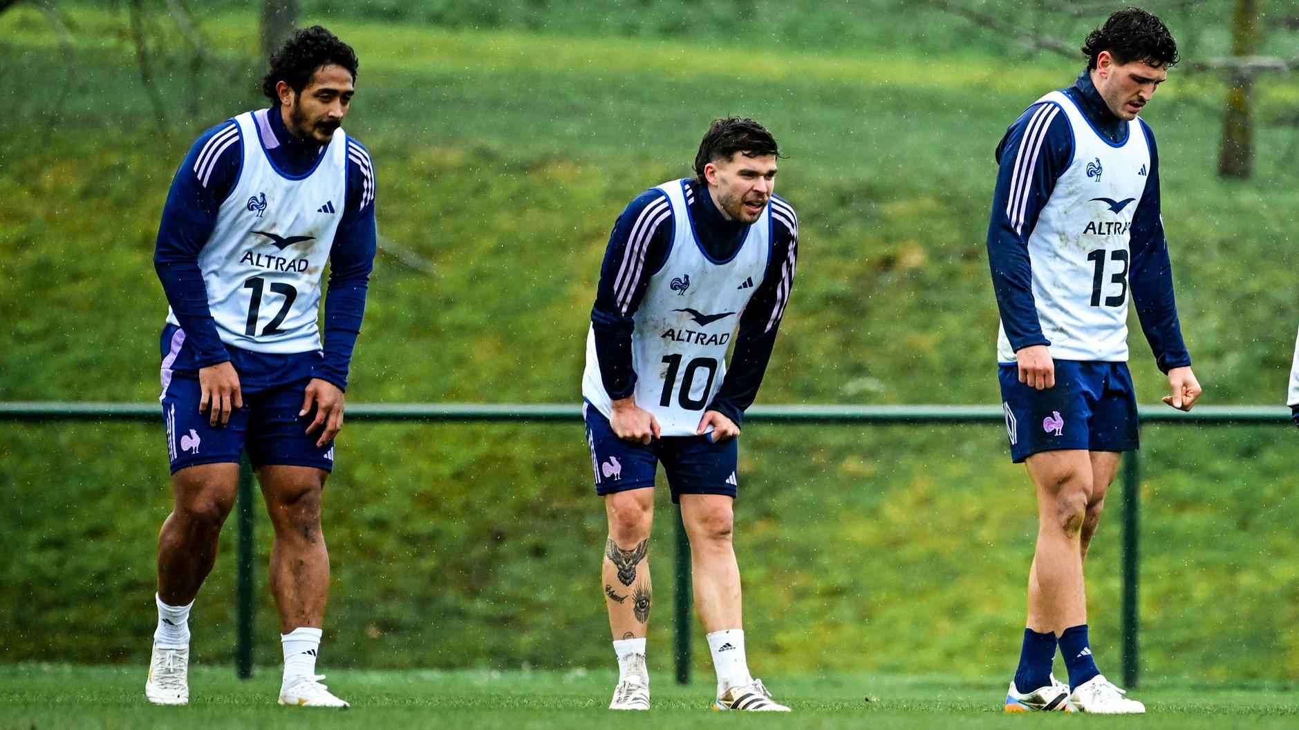 Yoram Moefana, Matthieu Jalibert et Nicolas Depoortere lors d’un entraînement du XV de France à Marcoussis.