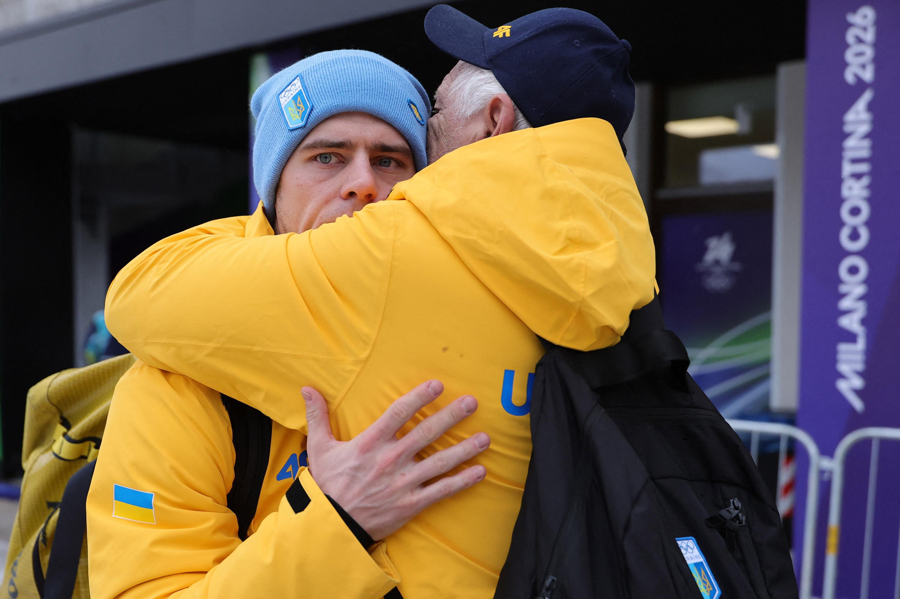 Vladyslav Heraskevych prend dans ses bras un membre de son équipe après sa disqualification pour avoir porté un casque en hommage aux athlètes décédés lors de l’attaque de la Russie contre l’Ukraine après une réunion prévue avec la présidente du CIO Kirsty Coventry.