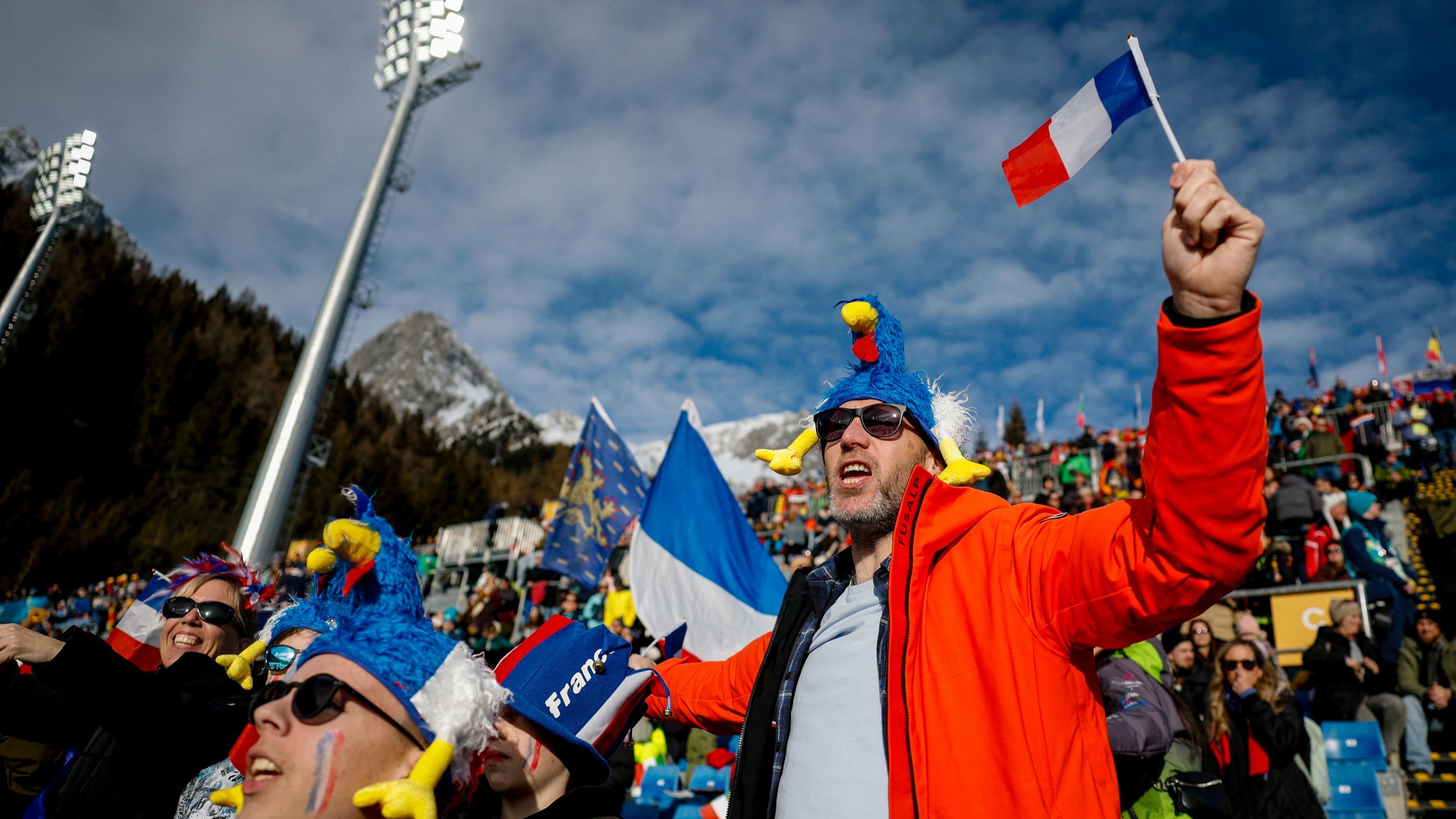 Des supporters français célèbrent la victoire de Quentin Fillon Maillet lors de l’épreuve de biathlon sprint 10km, à Anterselva (Val Pusteria), le 13 février.