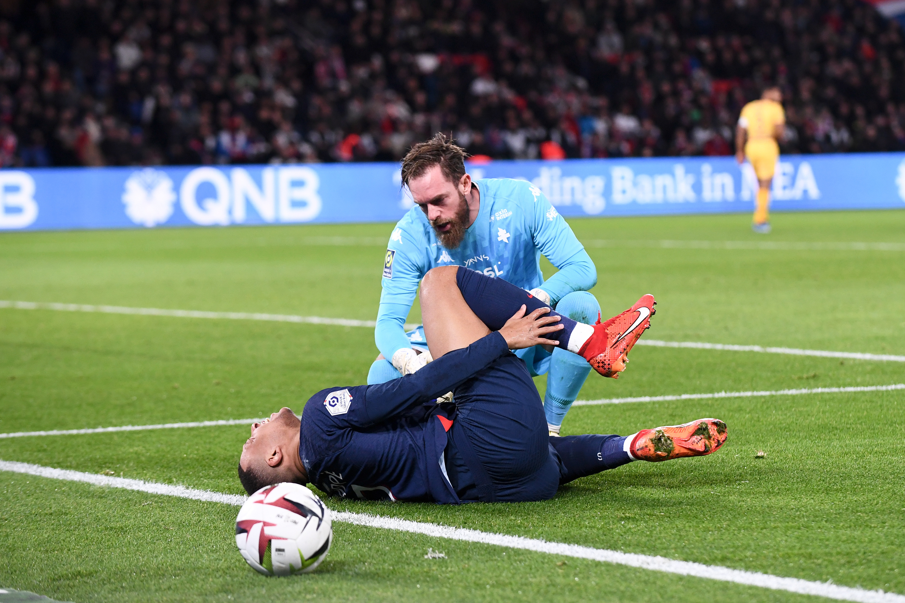 Kylian Mbappé au sol après un contact avec Alexandre Oukidja le 20 décembre 2023 lors de PSG-Metz au Parc des Princes.