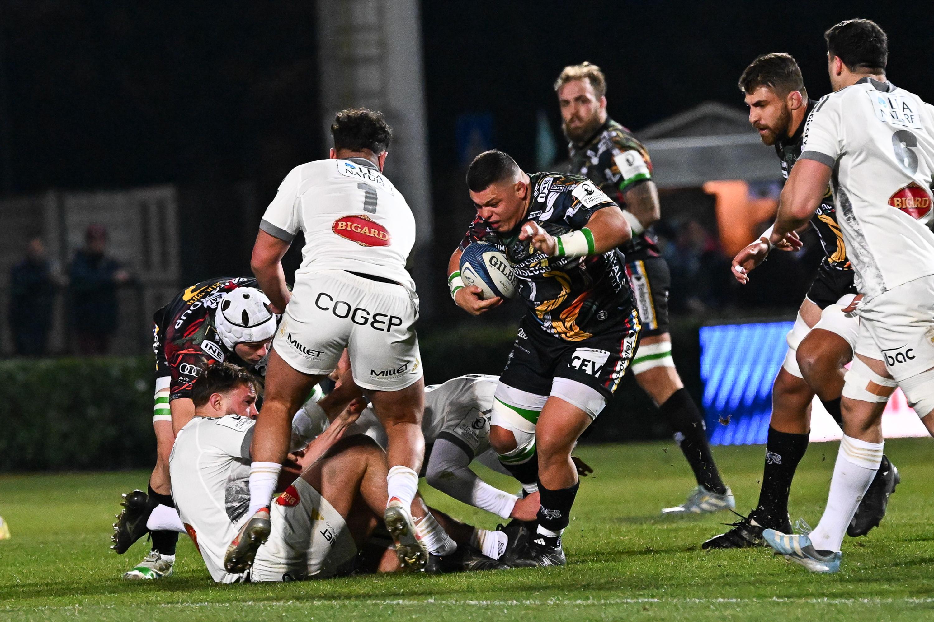 Thomas Gallo, ballon en main, lors d’un match de Champions Cup entre Benetton Rugby et le Stade Rochelais, le 18 janvier 2025.