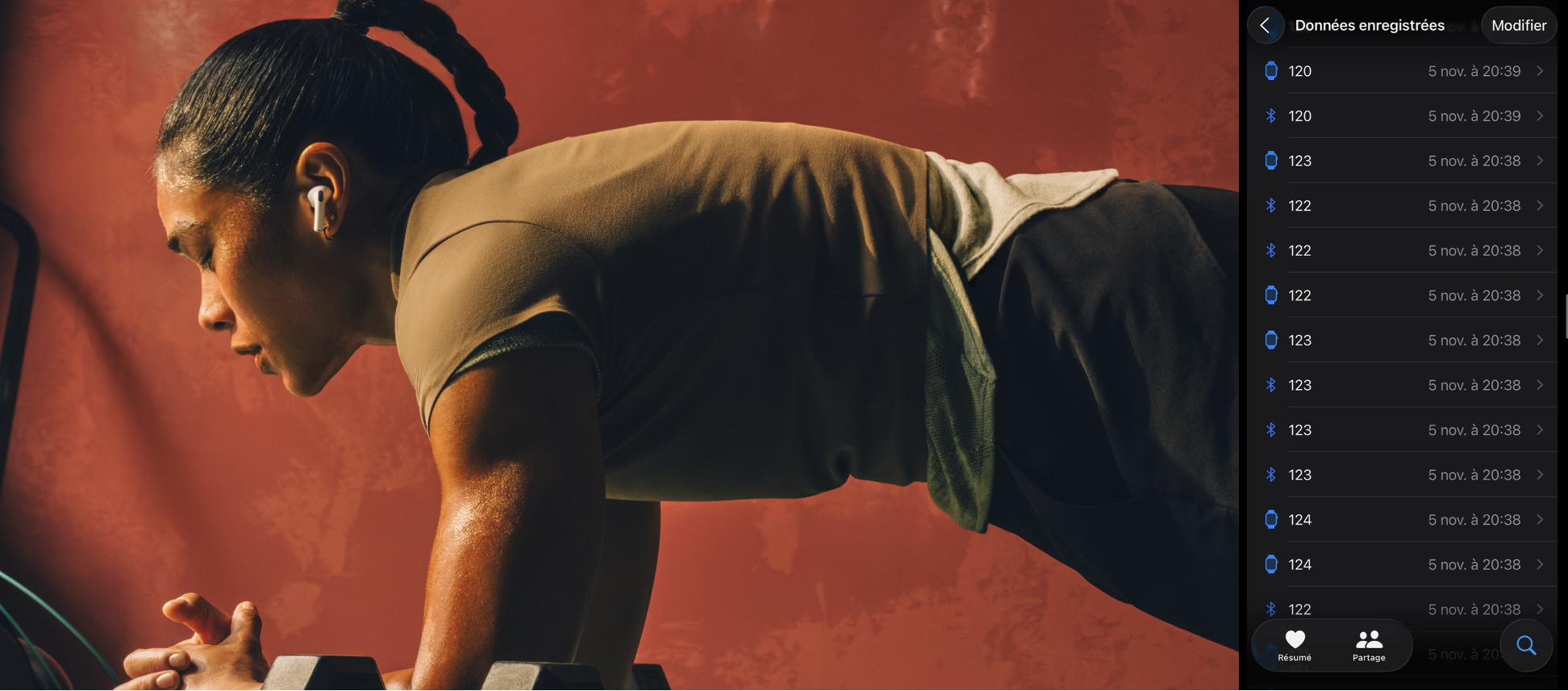 À droite, données cardiaque Apple Watch + AirPods Pro 3 d'un de mes entraînements