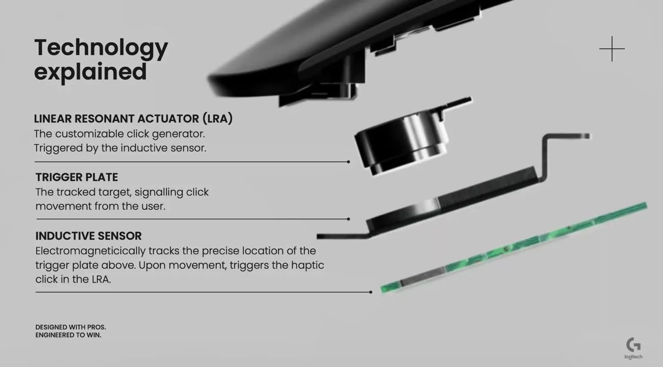 La détection du clic se base sur un capteur capacitif, ce qui amène quelques avantages. Premièrement, le résultat n'est plus binaire comme avec un interrupteur : il est possible de détecter la pression (comme sur les trackpads des Mac) ou de mesurer (et fixer) la distance d'activation (il y a dix paliers). C'est une technologie déjà déployée dans certains claviers, qui permet un peu plus de flexibilité mais aussi, selon Logitech, permet de réduire la latence du clic d'environ 30 ms. C'est une valeur finalement assez importante : pour rappel, un jeu qui fonctionne à 60 images/s voit chaque image affichée pendant environ 16 ms.