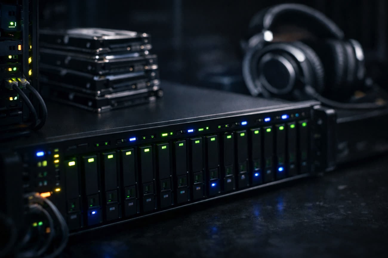 Pour stocker une telle bibliothèque, la solution la plus sage est de se tourner vers un NAS 16 baies. Dans ce segment, les prix oscillent généralement entre 3 000 et 6 000 € pour le boîtier nu. On lorgnera du côté des Synology RS2825RP ou RS4021xs, ou encore du QNAP TS-1673AU-RP. Quoi qu’il en soit, prévoyez une pièce isolée : l'ensemble est particulièrement bruyant en pleine charge.