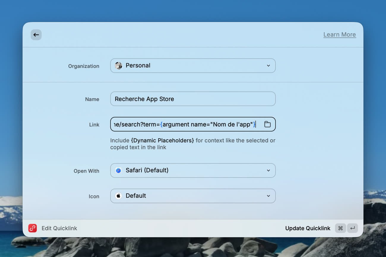 Qui dit App Store au complet, dit aussi recherche. Il fallait jusque-là ruser pour trouver une app dans le navigateur web, en général une recherche sur Google ou un autre moteur en se limitant au nom de domaine qui existait déjà. Ce n’est plus nécessaire maintenant, on peut utiliser le moteur de recherche intégré en haut de la barre d’URL et obtenir une page avec les résultats, comme ceci. Mieux, on peut facilement initier une recherche depuis un lanceur comme Raycast en reprenant l’URL de la boutique. Par exemple, pour chercher une app iPhone, on utilisera ce lien :