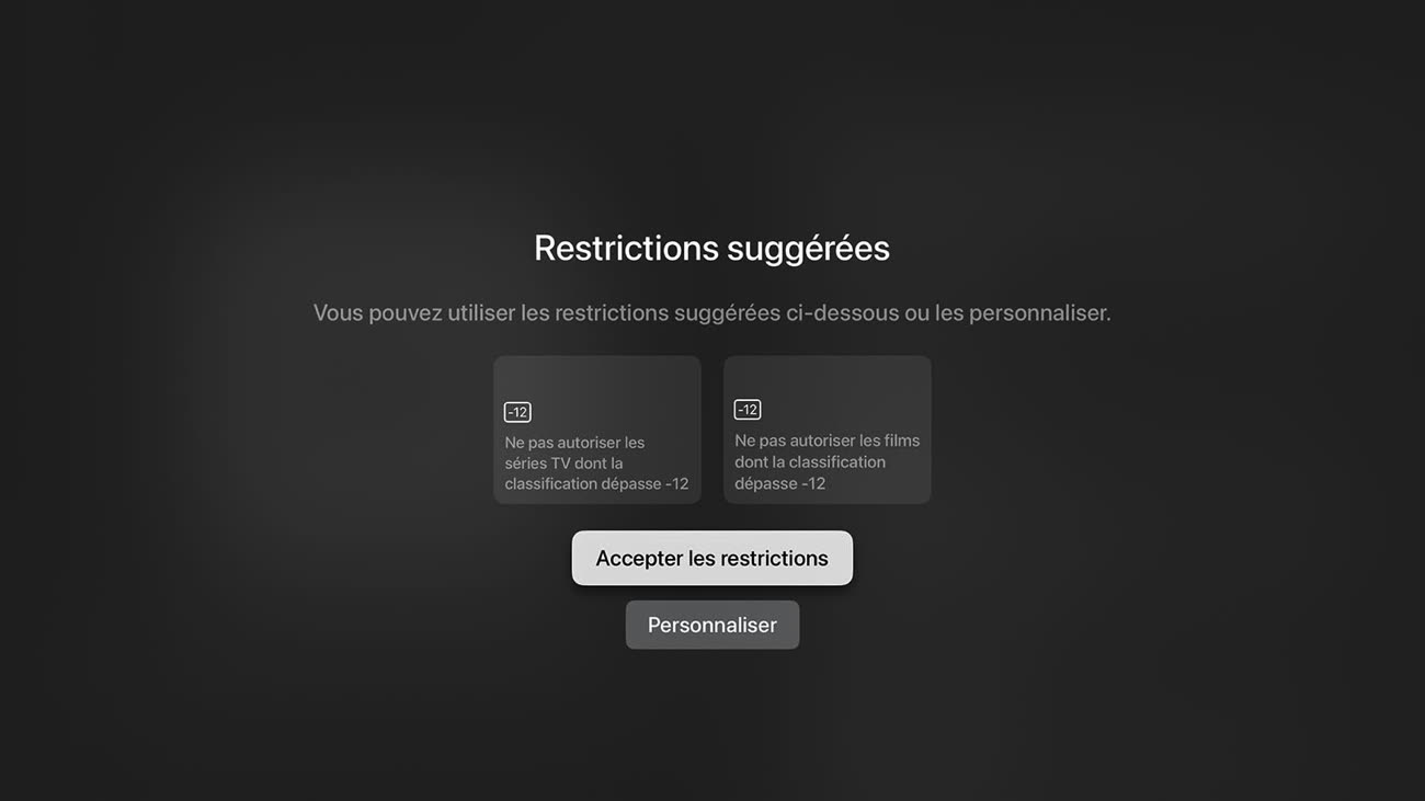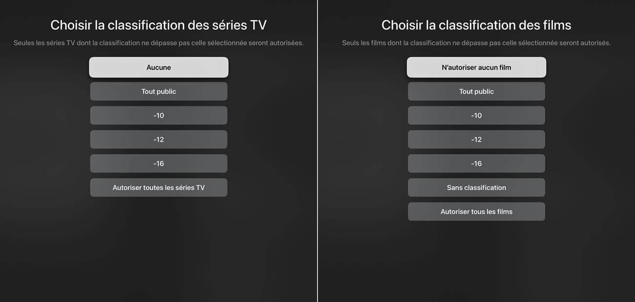 Pour les séries TV, Apple propose plusieurs paliers : tout public, déconseillé aux moins de 10 ans, de 12 ans, de 16 ans ou un accès à toutes les séries. Pour les films, les limites sont les mêmes, avec en plus un réglage pour les films sans classification. Les réglages dépendent des pays : les classifications européennes diffèrent de celles employées aux États-Unis, par exemple.