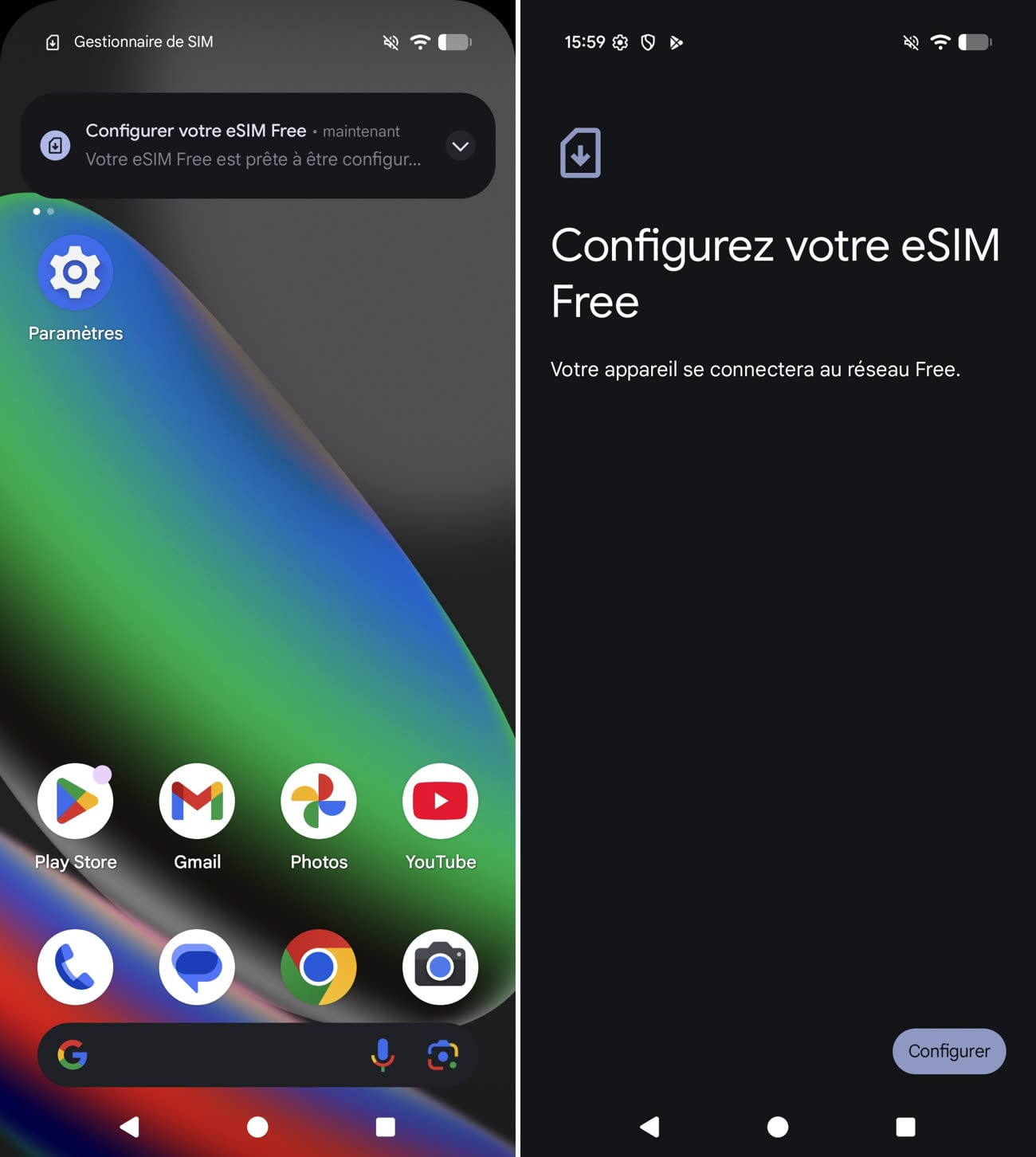 Lorsque vous recevez un nouveau smartphone acheté chez Free pour lequel vous avez choisi une eSIM, celle-ci y est déjà préinstallée. Au premier allumage, il suffit de se connecter au Wi-Fi pour activer l’eSIM en suivant les instructions. Cela évite d’avoir à scanner un QR code dans un email ou dans son espace client. Cette activation facile fonctionne à partir des iPhone 13 et sur divers smartphones Android (Pixel 9 et 10, Samsung A54 et S24…).