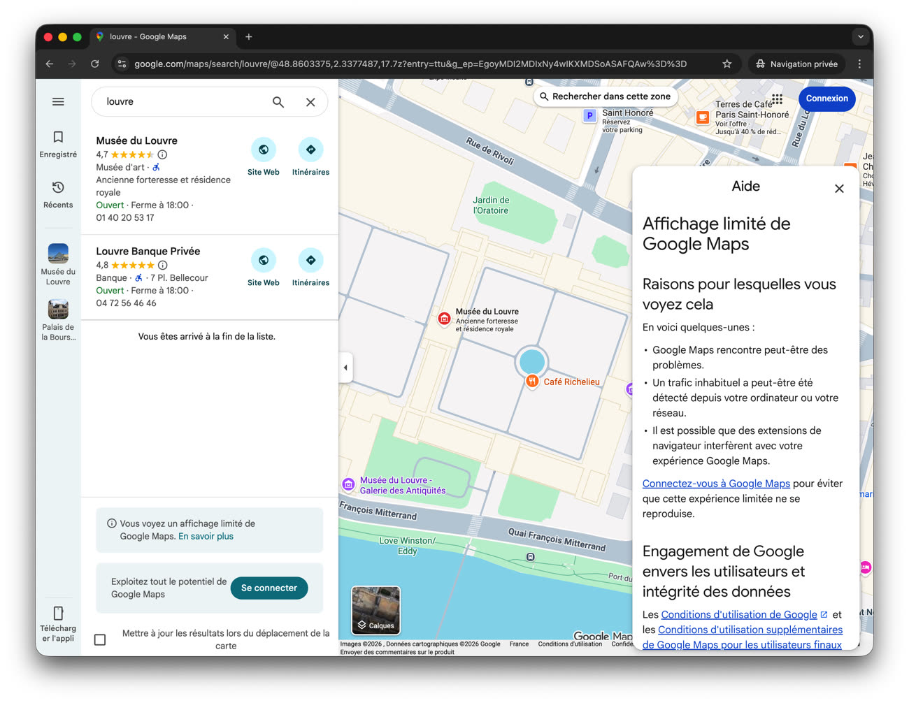 Dans le panneau d’information associé à ce mode limité, Google précise qu’il peut s’activer lorsque certaines extensions interfèrent avec Maps. D’après nos essais, les bloqueurs de publicité n’y changent rien. En pratique, seule la connexion à un compte Google semble réellement lever ces restrictions. L’entreprise invite d’ailleurs explicitement les utilisateurs à se connecter pour bénéficier de l’expérience complète de Maps.