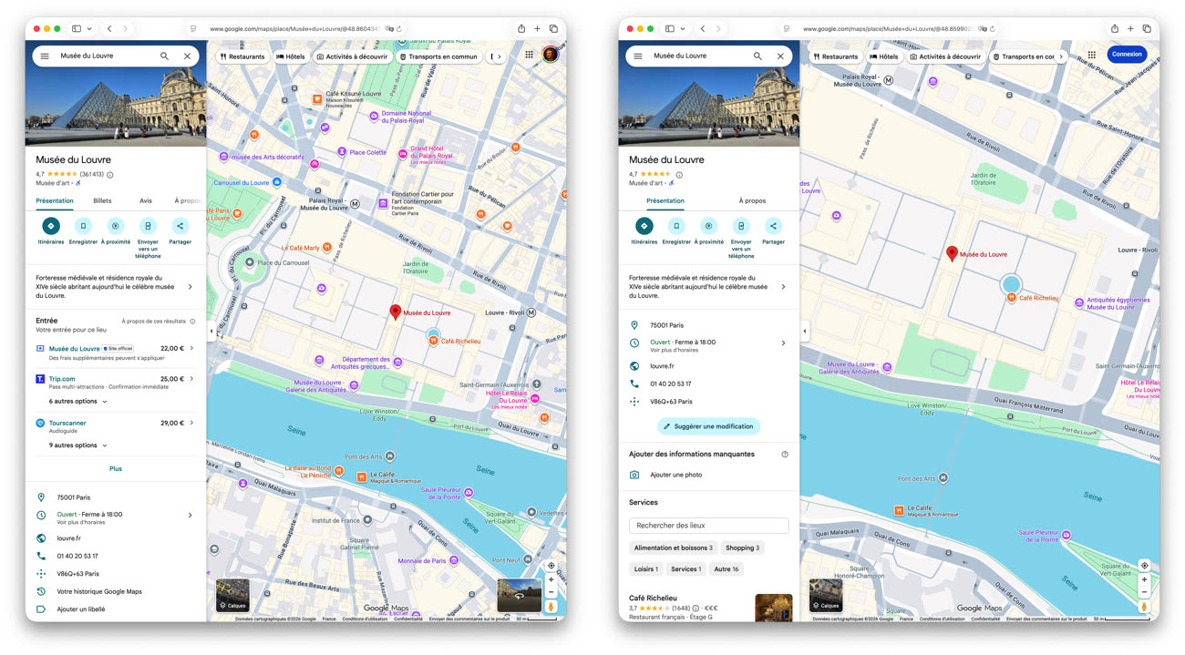 Comme nous avons pu le vérifier (il suffit de se déconnecter ou de passer en navigation privée), tous les contenus liés à la communauté disparaissent des fiches des points d’intérêt : avis, photos et indicateur d’affluence. Les liens vers les billetteries sont également masqués. Il reste toute de même les infos essentielles, notamment les horaires et les coordonnées.