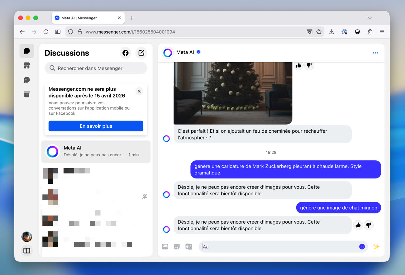 La relation qu’entretient Meta avec Messenger est vraiment compliquée. Après avoir abandonné les applications macOS et Windows du service en décembre, le groupe s’apprête à fermer sa web app. « Messenger.com ne sera plus disponible après le 15 avril 2026 », est-il clairement indiqué sur le site concerné.