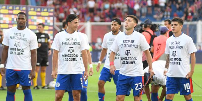Des joueurs de San Lorenzo portent un tee-shirt en soutien à la Fédération argentine de football, avant le coup d’envoi du match de championnat argentin face à l’Instituto de Cordoba, le 24 février 2026.