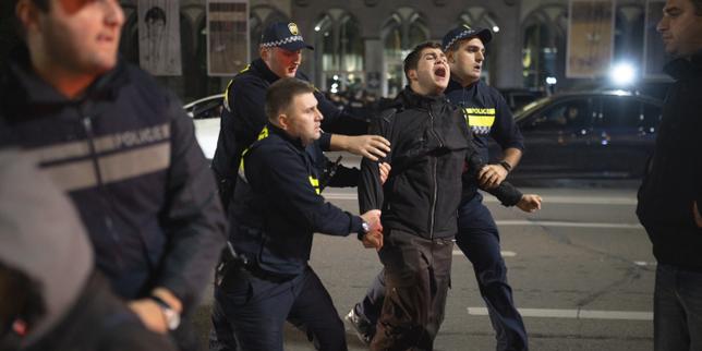 Arrestation de manifestants, avenue Roustavéli, à Tbilissi, le 22 octobre 2025.