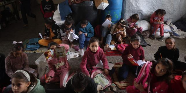 Des enfants palestiniens, dont beaucoup font partie de familles déplacées, suivent les cours à l’école mixte de l’UNRWA à Deir Al-Balah, dans la bande de Gaza, le 6 décembre 2025.