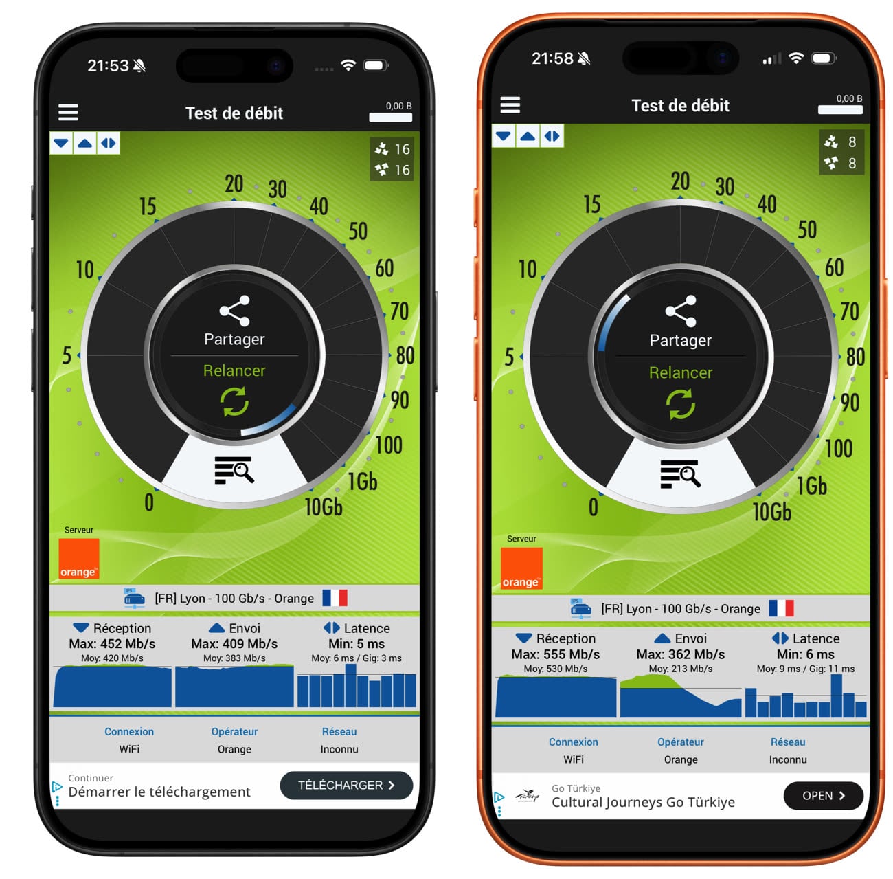 De notre côté, nous avons réalisé des tests de débits avec une Livebox 4 sans constater de comportement anormal. À proximité du routeur, un iPhone 15 Pro atteint jusqu’à 452 Mb/s en réception, tandis qu’un iPhone 17 Pro fait encore mieux, avec 555 Mb/s.