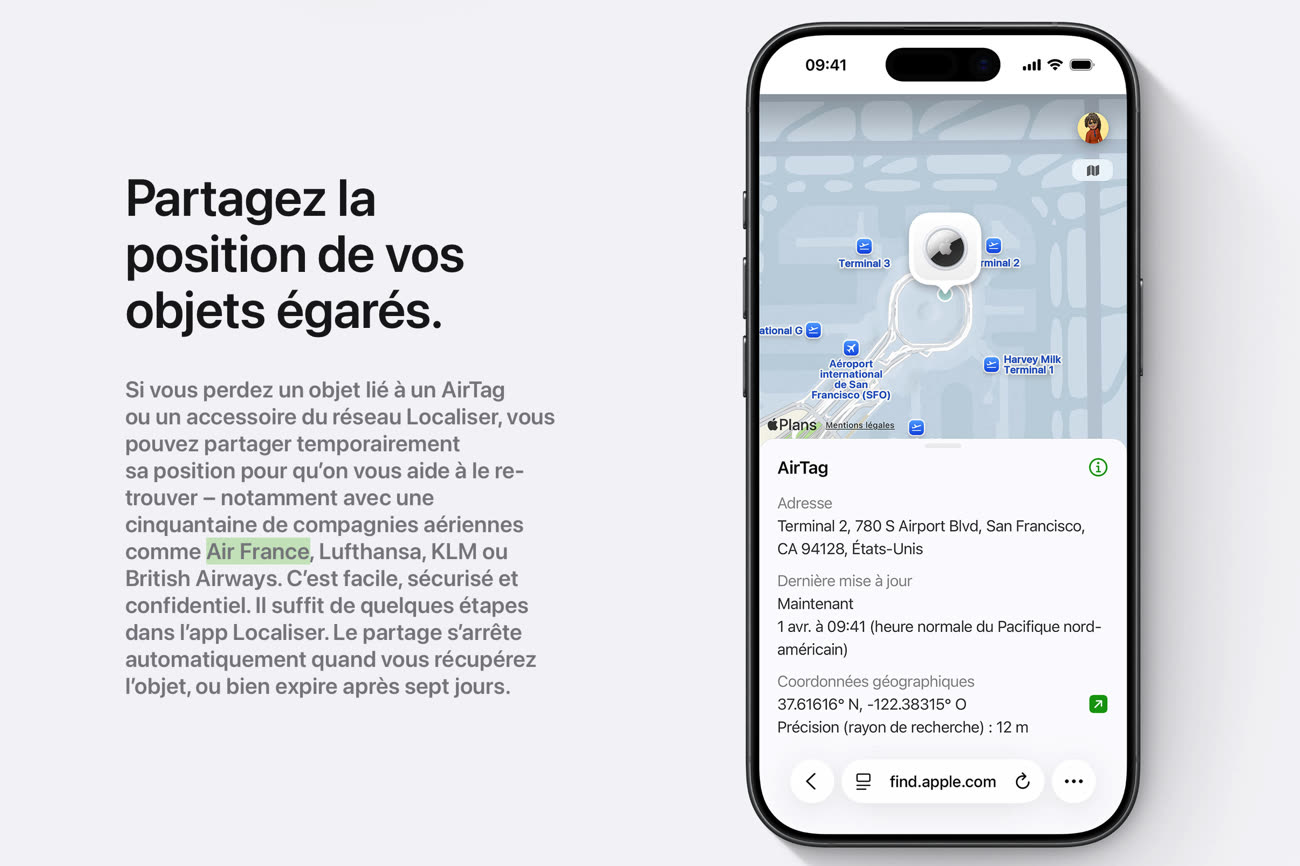 Comme bon nombre de ses concurrents, Air France va bientôt gérer les AirTags pour retrouver des bagages volés. Cela n’a pas encore été officialisé par l’entreprise française, mais nous avons quasiment aussi bien, puisque c’est Apple elle-même qui le souligne désormais sur la page dédiée à son traqueur. Dans un nouveau paragraphe dédié au partage d’un AirTag perdu avec les compagnies aériennes, on peut en effet repérer le nom d’Air France, aux côtés de KLM, Lufthansa ou British Airways données en guise d’exemples.