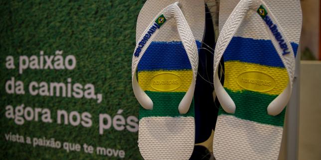 Des tongs brésiliennes Havaianas en vente dans un magasin à côté d’une pancarte « La passion du maillot, maintenant aux pieds », à Sao Paulo, au Brésil, le 28 novembre 2022.