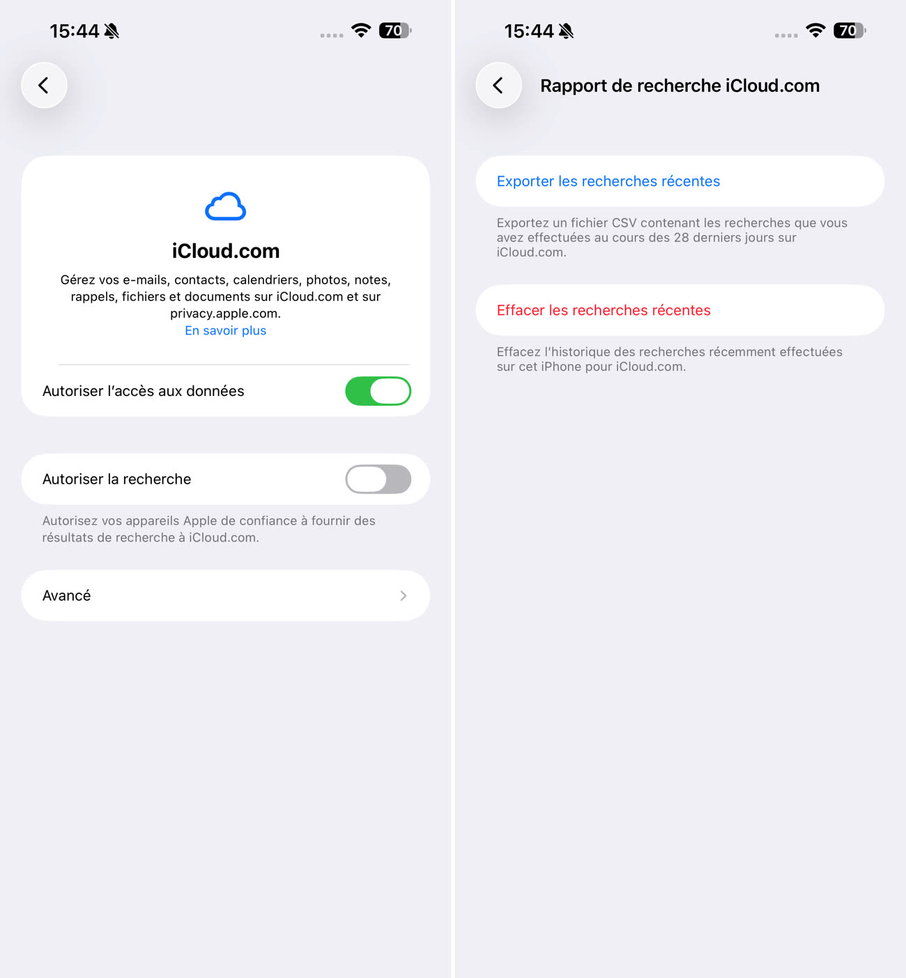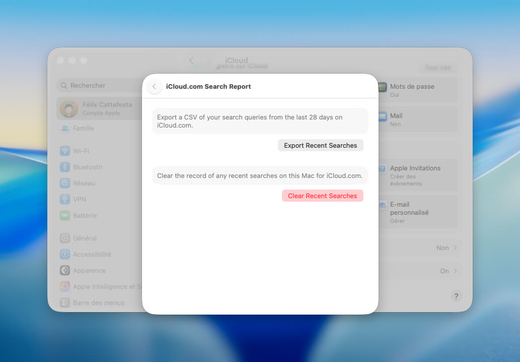 L’option est aussi proposée sur iPad et sur Mac. Il est également possible d’exporter un fichier CSV de ses recherches effectuées sur iCloud.com pendant les 28 derniers jours. Un bouton permet également de supprimer ses dernières recherches sur l'appareil.