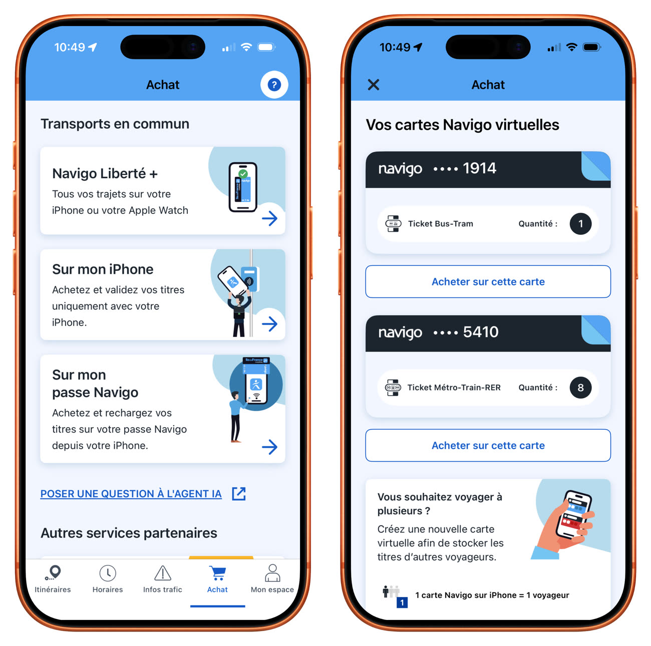 On en vient à l’iPhone. Depuis le printemps 2024, il est possible d’acheter la plupart des pass Navigo directement dans l’application Cartes d’Apple (Wallet), puis de valider ses trajets avec son iPhone par NFC. Une autre méthode consiste à acheter son titre depuis une application : cela peut être bien sûr l’app IDFM, mais aussi Bonjour RATP ou SNCF Connect, qui proposent la plupart des pass Navigo.